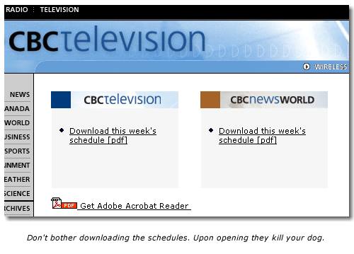 Pathetic point 2: schedules can be downloaded as PDF files, files that appear to be corrupt and definitely don’t look in my Acrobat Reader. What gives?